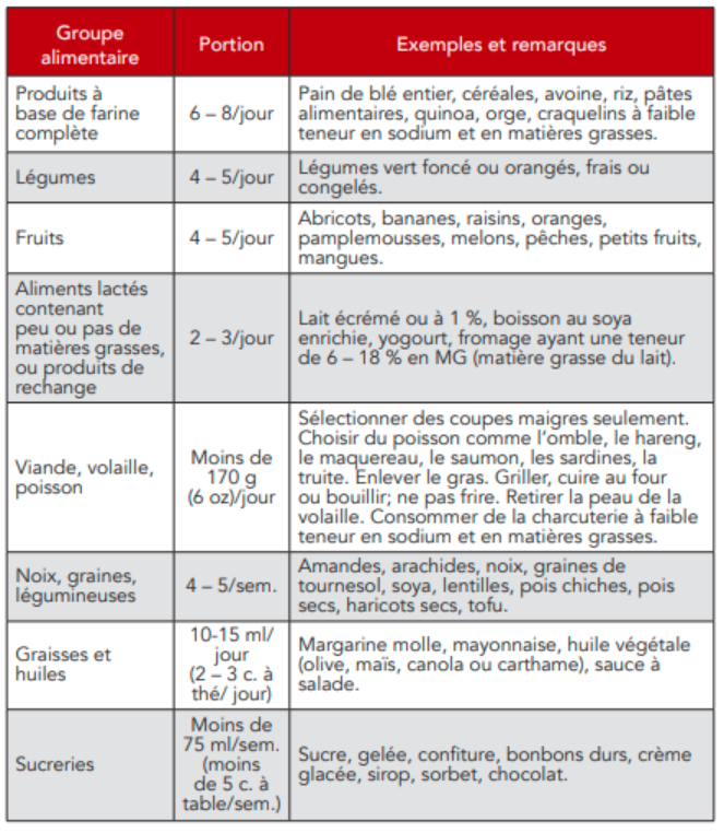 Pour faire simple, notons que le guide alimentaire canadien, qui a été révisé ces dernières années, est très bien fait et ressemble beaucoup au régime DASH et au régime méditerranéen, deux types d’alimentation qui ont été démontrés bénéfiques pour la prévention cardiovasculaire et le traitement de l’hypertension artérielle et la haute pression.